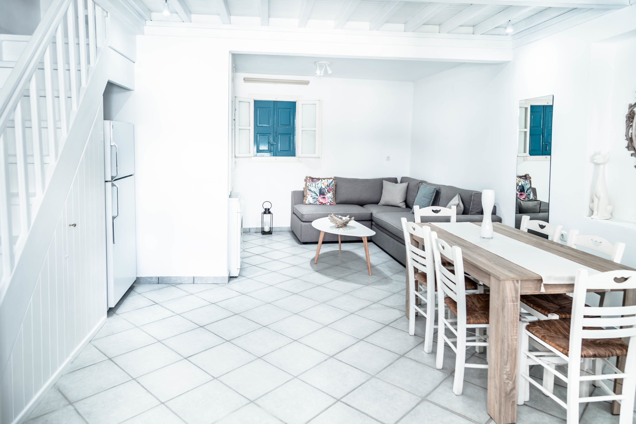 The apartment has a breathtaking view of Mykonos and all the amenities one may need: A/C, TV, a big kitchen, a beautiful living room, WiFi, and even a washing machine; a modern apartment with a touch of Mykonian spirit.